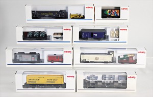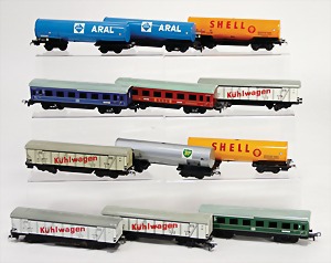 H0, 12 Teile Güterwagen, 2 u.- 4-achsig, 4341, 4319, 5208, 5361, 5222, 5523, 5386, 5226, 5372, 5213, 5288, 5287, sowie 2 Wagen, Schachtel ohne Aufdruck, alles mit K, neuwertig, Orig.-Kart.