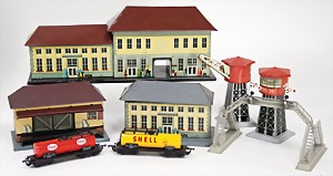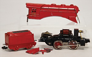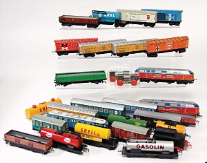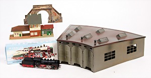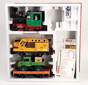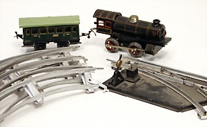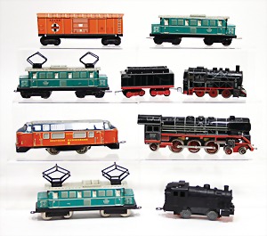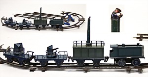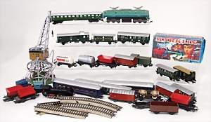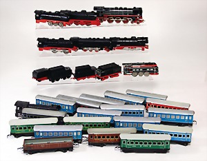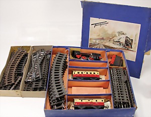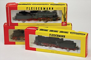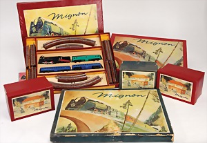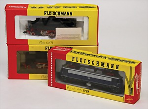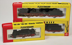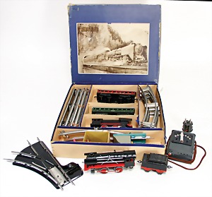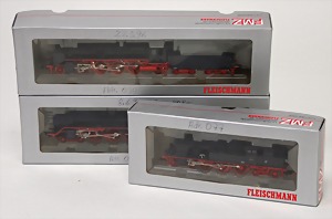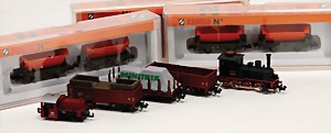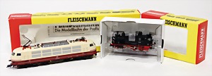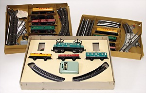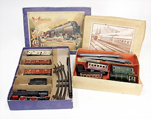 2x Orig.-Kart. mit Eisenbahn, 1x Spur0, von HWN, Lok von FLEISCHMANN, Tender, 3 Waggons, Gleismaterial, im Orig.-Kart., dazu Lok mit Tender u. 3 Waggons, wohl Karl Bub, bespielt, im Org.-Kart.