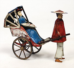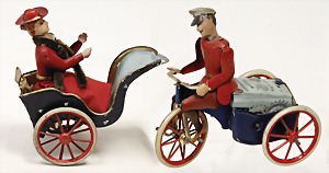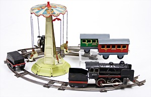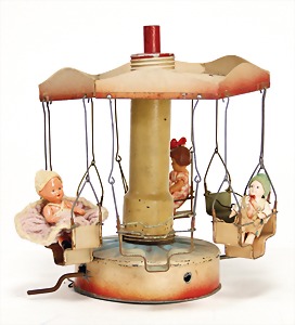 Blechkarussel, wohl Doll, gem. RL1. 38/4, Blech lithogr., altersbed. Farbabplatzer, mit 6 Gondeln, daui 3 Celluloid-Püppchen, H: ca. 25 cm