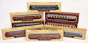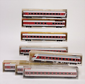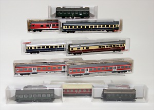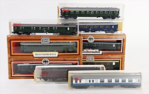 Konv. Personenwagen, 3 u.- 4-achsig, 10 Teile, 5063, 5098, 5099, 5646, 5647, 5648, 5173, sowie 3 Wagen im Kart. ohne Aufdruck, sehr guter Zust., Orig.-Kart.