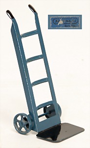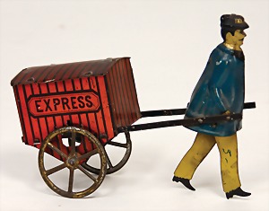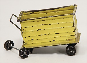 Gepäckwagen, Uralt, Blech handlackiert, 12,5 cm, 1 Griffstange fehlt, 1 Achse liegt lose bei, bespielt, Lackfehler