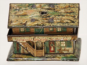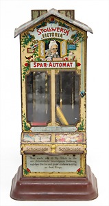 Schokoladenautomat "Victoria", Blech lithogr., seitl. mit Motiv "Hänsel und Gretel", altersbed. Lackfehler, Orig.-Zust., 27 cm, Schlüssel fehlt