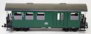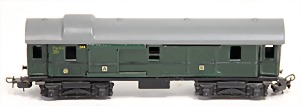 Personenwagen, Metall, Holz, Spur 1, 60 cm, Pullman, 4-achig, Federpuffer, 1 Tür eingefallen, bespielt, Lackfehler am Dach, ausgefallen