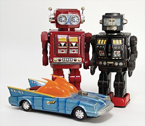 2 Teile Roboter, Made in Japan, 29 cm, dunkel, Batteriefach angerostet, 30 cm, rot, gut, 1 Spacewagen, Japan, Batterieantrieb, 31 cm, gut, tech. nicht geprüft