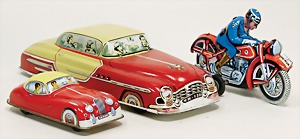 3 Teile Blech, Huki Limousine, 60er Jahre, Schwungradantrieb, Blecht lithogr., 28 cm, Huki Jaguar, 14 cm, Schiebeauto, Blech lithogr., 1 Motorrad, neuere Produktion, Schwungradantrieb
