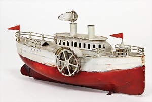 Raddampfer, 26 cm, Blech handlackiert, Uhrwerk intakt, bespielt, altersbed. Lackfehler, teilw. farbl. ausgebessert