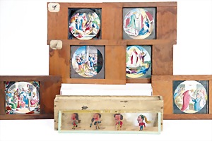 Laterna Magica, Bildstreifen, 12 Teile, dazu 7 Glasbilder, sakrale Szenen, 17,5 cm x 10,5 cm