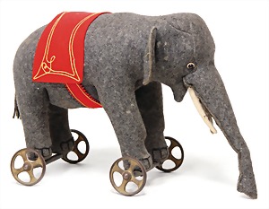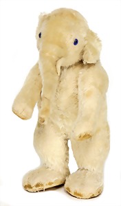 Purzel-Elefant, 1909/1910, Höhe sitzend 23 cm, mit Knopf, Schuhknopfaugen, Mohairplüsch, Filz-Stoßzähne, jeweils minim. Fehlstelle vorne, ein paar Stellen Mohairverlust, Filztatzen gut, funktionstüchtig, selten
