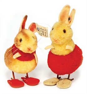 Rabbit, Miniatur-Hasenpärchen, 9 cm, hellbraun/rot, aufwartend, Kopf drehbar, Metall-Beine, Filz-Pantoffeln, Männchen, kompl., mit Knopf u. weißer Fahne, Nr. 4509.01, Mädchen, mit Knopf, Reste der weißen Fahne, sehr guter Zust.