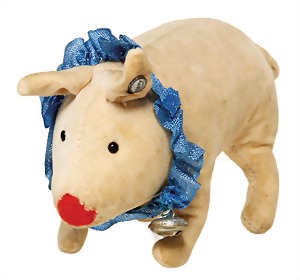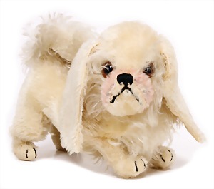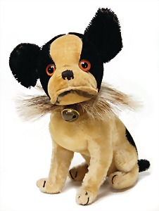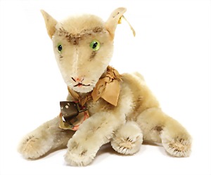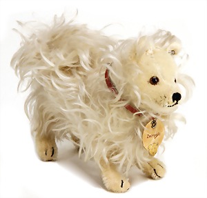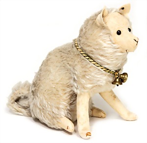 Bully, ca. 33 cm, hergestellt 1927 – 1931, sitzend, mit Orig.-Halsband sowie Krause, Krause teilw. ausgegangen, mit 10 Steiff Knöpfen bestickt, drehbarer Kopf, Mohair weiß u. kupferfarben, starker Abrieb an den Vorderpfoten