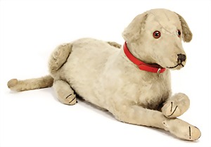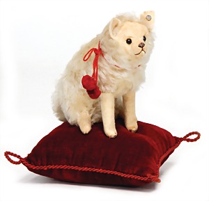 Spitz, Mohairplüsch, blond, sitzend, rote Kordel durch Kordel mit 2 Glocken ergänzt, Sitzhöhe: 17 cm, Schuhknopfaugen, mit Knopf, Maulbestickung fehlt, 1 Pfote minim. aufgegangen, sonst guter Zust., 1905