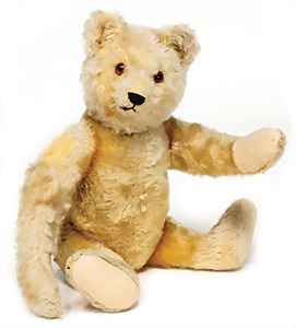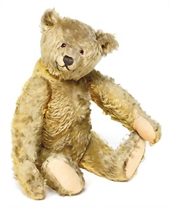 Bär, ca. 1930, 42 cm, goldblond, Vorderseite etwas ausgeblichen, mit Knopf kl. Buckel, lange abgeknickte Arme, Filztatzen bis auf minim. Stelle gut, ein wenig Mohairverlust um die Nasenspitze, sonst gut, schöner Ausdruck
