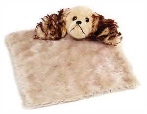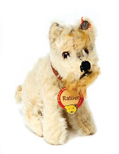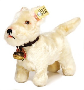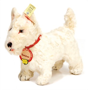 Sealyham, Hund, in Kunstseidenplüsch, mit Knopf, Schild u. Fahne, Nr. 167,0, sehr schöner unberührter Orig.-Zust., leichte Rosafärbung im Gesicht, H: 17 cm, L: ca. 22 cm