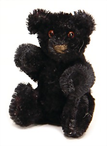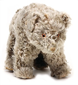 ZOTTEL-BÄR, langhaariges Mohairplüsch, dunkel melliert, stehend, ohne Räder, Druckstimme intakt, kl. silberner Knopf, Reste weißer Fahne, Filz u. Mohair in sehr gutem Zust., Höhe: 29 cm, 1925 - 1927