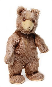 Kurzplüsch, Braunbär, ca. 1908, Schuhknopfaugen, 50 cm lang, mit Zugstimme (intakt), mit Knopf, Reste weißer Fahne, Nasenbestickung etwas abgerieben, kl. Flickstelle an 1 Ohr, sonst guter Zust.