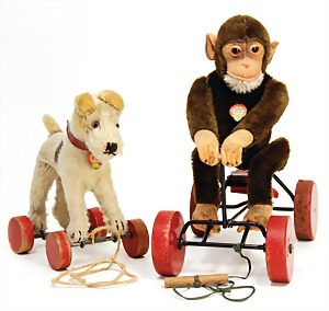 2 Teile, Nachkrieg, 1x Foxterrier, 22 cm lang, 17 cm hoch, auf roten Holz-Rädern, mit Schild, rote Schrift: FOX, mit Knopf, bespielt - gut, 1x Affe, Record-Peter, mit Schild, ohne Knopf, Stimme intakt, guter Zust.