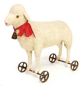 Lamm, 30 cm, 1920/21, Lammfell, weiß, stehend auf Metall-Räder, mit Knopf, Nasenbestickung abgerieben, kl. offene Stellen am Maul, sonst gut