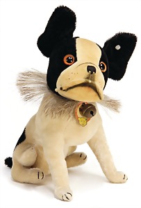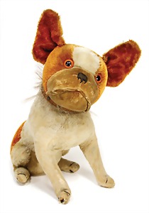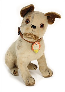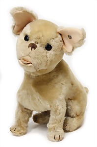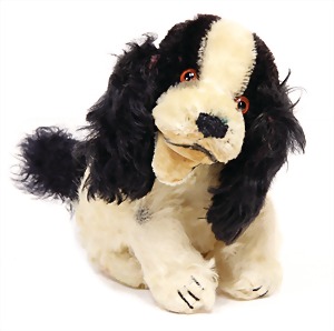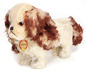 Hund, Charly, Vorkrieg, 30 cm, mit Knopf u. Schild, Schild altersbed. etwas verschlissen, leicht bespielt - guter Zust., Druckstimme defekt