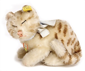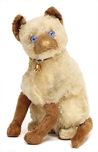 Siam-Katze, Mohairplüsch, meist mit dunkle Schattierung, sitzend, mit Knopf, langgezogenes f, drehbarer Kopf, blaue Glasaugen, 26 cm Sitzhöhe, hergestellt ca. zw. 1930 – 1932, etwas eingestaubt