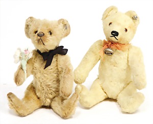 2 Teile, Orig.-Teddy´s, 1x 14 cm, Knopf, Schild u. Fahne, Nr. 5315, Ende der Fahne weggeschnitten, 1 x 25 cm, ohne Knopf u. Schild, Druckstimme intakt, guter Zust.
