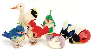 6 Wollminiaturen, Hummel, mit Fahne, Fahne gesteckt, ohne Knopf, Storch, mit Knopf u. Fahne, Nr.7460/11, liegende Katze, mit Knopf u. Fahne, Nr. 7295/04, 3 Vögel, Nachkrieg, guter Zust.