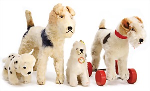 4 Teile, 1x Chow, kompl., Nr. 3510.00, kl. Stelle am Ohr Fellverlust, sonst gut, 1x Foxterrier, 20 cm, auf roten Holzrädern, mit Knopf u. Fahne, Nr. 1317.10, 1x Rolly, Dalmatiner, 12 cm, mit Knopf, Reste gelber Fahne, guter Zust., selten, 1x Foxterrier, Seidenplüsch, Kriegs-Produktion, mit Knopf, 23 cm