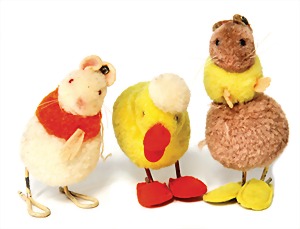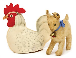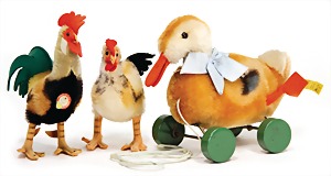3 Teile, Nachkrieg, 1x Hahn, kompl., Nr. 335/17, 1x Huhn, ohne Knopf u. Schild, 1x Zug-Ente, kompl., Nr. 2314.13, Stimme intakt, guter Zust.