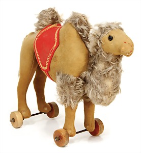 Kamel, ca. 1921, auf Holzrädern, mit Mohair/Filzverarbeitung, Mohair teilw. etwas berieben, Schuhknopfaugen, beriebene Nasenbestickung, 23 cm hoch, 25 cm lang, kl. Flickstelle seitl., sonst guter Zust.