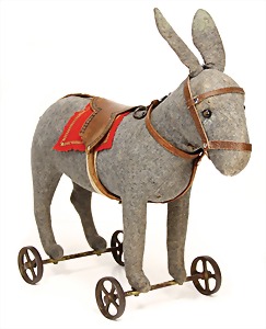 Esel, ca. 1921, mit Knopf, langgezogenes f, auf Gussspeichenrädern, ohne Verbindungsschienen, ca. 32 cm hoch, Filz bis auf kl. Stellen in gutem Zust., Mottenfraßlöcher am Hals sowie an den Hinterbeinen, Schwanz geflickt, altes Orig.-Geschirr mit Steiff Druck, Ziehstimme intakt