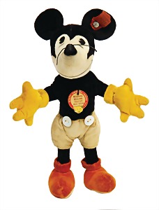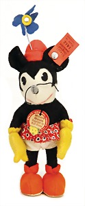Minnie Mouse, hergestellt zw. 1932 – 1936, Cooperation with Walt Disney, mit Knopf, Brustschild u. unberührter Fahne, Nr. 1412, Samt schwarz/weiß, stehend, aufgeklebte Augen, Unterrock, orangene Schuhe, gelbe Handschuhe, roter Hut mit Filzblumen, sehr schöner unberührter Orig.-Zust., Schwanz fehlt, sonst absolut unberührt