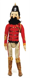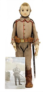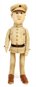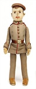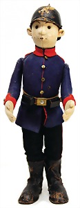 Engl. Soldat Tommy, ca. 38 cm, hergestellt ca. zw. 1910 – 1915, Filz, gegliedert, Artikelbezeichnung Tommy 35, Filz-Uniform sowie Gesicht u. Hut vereinzelt kl. Mottenlöcher, mit Knopf im Ohr, Schuhknopfaugen, ausgefallen