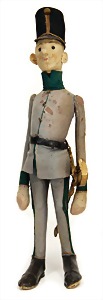 Karikaturfigur, Kaiserjäger, Leutnant, hergestellt zw. 1911 – 1913, ca. 44 cm, Artikelbezeichnung Kalo 45 Österreichischer Soldat, mit Knopf, vereinzelt Flickstellen am Brustkorb sowie Arm, sonst gut