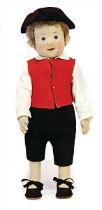 Bauer Hans, hergestellt zw. 1989 – 1919, Filzfigur, gegliedert, Schwäbischer Bauer, rote Weste, blaue Glasaugen, Filzweste mit 6 Steiff-Knöpfen, langgezogenes f, ca. 42 cm, schöner Orig.-Zust.