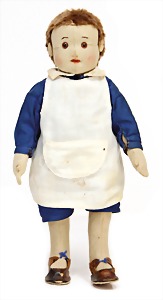 Puppe, Filzfigur, mit Knopf im Ohr, eingesetztes Mohair, 33 cm, Schürze mit Flickstelle, Filzgesicht in gutem Zust.