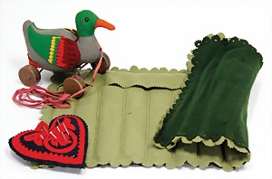 Konv., Ente, Vorkrieg, Filz, auf Holz-Exzenterrädern, hergestellt zw. 1916 – 1934, ca. 12 cm, mit Knopf, Filz in sehr gutem Zust., mit Zugleine, dazu Herz-Nadelkissen, Filz-Besteckhalter, wohl Nachlass Steiff, 24 cm hoch, 40 cm breit, an vereinzelten Stellen kl. Mottenlöcher, sonst gut