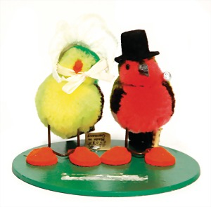 Gratulanten-Paar, Nomotta-Wolle, Wollvögel, hergestellt zw. 1936 – 1940, mit Knopf u. unberührter Fahne, Nr. 6508P, auf Karton, Woll-Vogeldame mit Häubchen, 1 x Mann mit Stock u. Zylinder, in orangenen Filz-Pantoffeln, sehr schöner Zust.