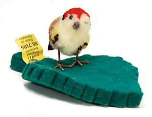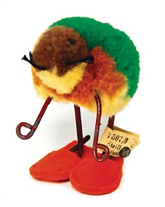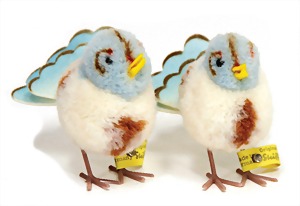 5 Teile Vögel, Wollminiaturen, Vorkrieg, davon 3 x mit Knopf u. Fahne, 2 Vögel ohne Knopf, guter bis sehr guter Zust., 1 Ente ohne Knopf u. Schuhe, Rad etwas angelaufen
