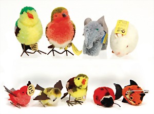 Konv. Vögel, Nomotta-Wolle, untersch. Zeitalter, 1 x früher Vogel, ca. 1940, mit Knopf u. Fahne, Nr. 6505,2, insgesamt 5 Wollminiatur-Vögel, dazu 1 Maus, mit Knopf u. unberührter Fahne, Schwanz fehlt, 1 kl. Marienkäfer