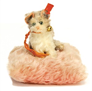 Nadelkissen, Fluffy, hergestellt ca. 1926, mit Knopf u. roter Fahne, Fahne leicht brüchig, Druck erkennbar, Nr. 86/3344,6, 13 cm, rosafarbenes Langmohair Nadelkissen, mit sitzender Katze, grüne Glasaugen, gespitztes Mohair, leicht eingestaubt, schöner Ausdruck, Ohren von außen umkettelt,