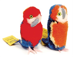 Konv. 2 Papageie, Wollminiatur, schöner Orig.-Zust., hergestellt ca. 1950, mit Knopf u. unberührter Fahne, Nr. 7481/06, mit Filz-Schnabel sowie Filz-Schwanz, 7 cm, unberührter Zust.