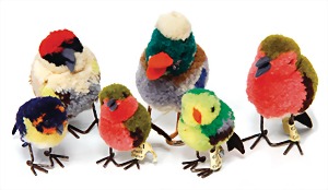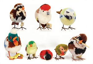 Konv. 3 Vögel, Nomotta-Wolle, 1 x Spatz mit Draht-Füßen, Knopf, Fahne, Nr. 6508,4, dazu 1 Spatz, mit Knopf u. gelber Fahne, Nr. 6508,43, dazu 1 kl. Spatz, mit Knopf u. unberührter Fahne, Nr. 6504,1, 4 – 6 cm