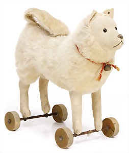 Spitz, hergestellt ca. 1915, auf Holzrädern, kurzes Mohairplüsch, weiß, stehend, mit Filz-Gesicht sowie Filz-Ohren u. –Beine, mit Knopf, langgezogenes f, Schuhknopfaugen, ohne Quasten, Stehhöhe ca. 25 cm, schöner Orig.-Zust.