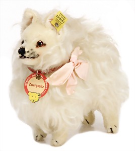 Zwergspitz, 1935 - 1943, Mohairplüsch, weiß, stehend, mit Knopf, langgezogenes f, mit Schild, geknickt, guter Zust.