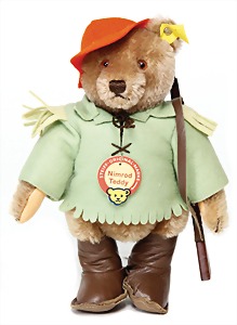 Nimrod Teddy, 22 cm, kompl., Nr. 5322N, Schild mit rot/brauner Schrift, Orig.-Filzkleidung mit Mütze u. Gewehr, braune Kunstlederstiefel, 1953/54, unbespielt