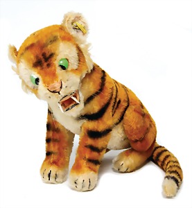 Tiger, 1952, Exportmodell USA, mit Knopf u. Fahne, Nr. 3325.2, schwach lesbar, Fahne verschlissen, Sitzhöhe 25 cm, Drehkopf, Karikaturaugen, off. Maul mit eingesetzten Zähne, guter Zust., Knickstelle am Schwanz