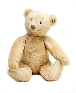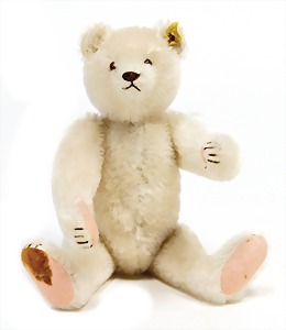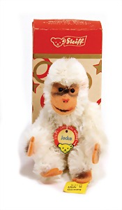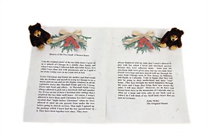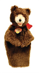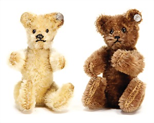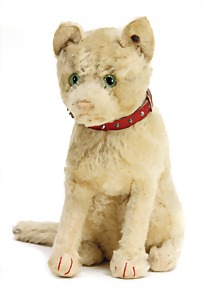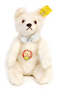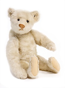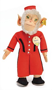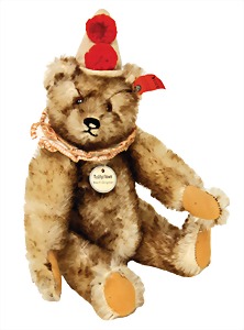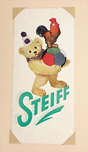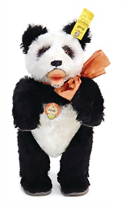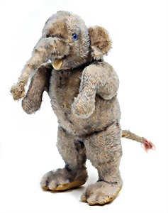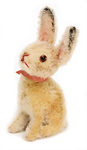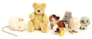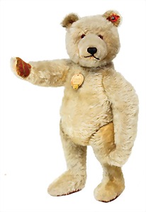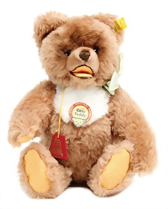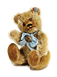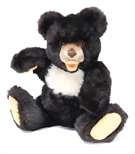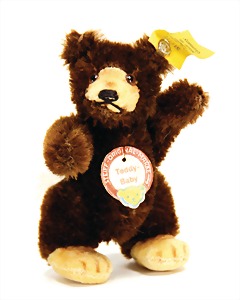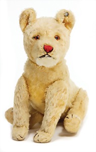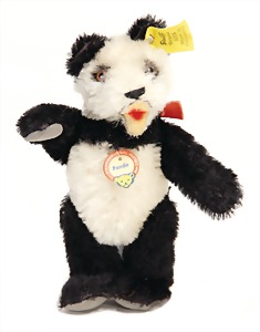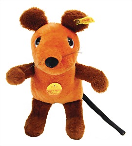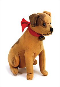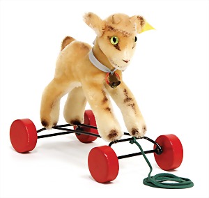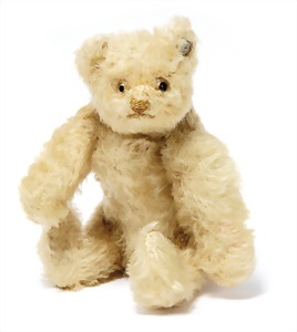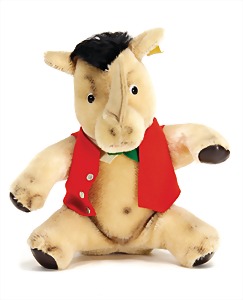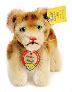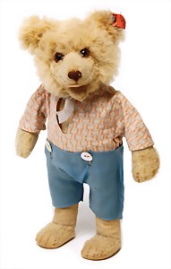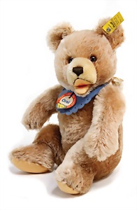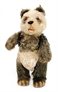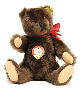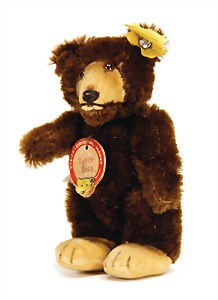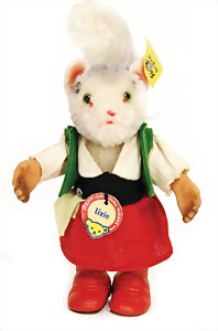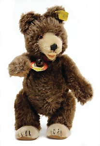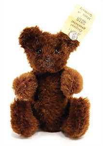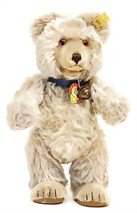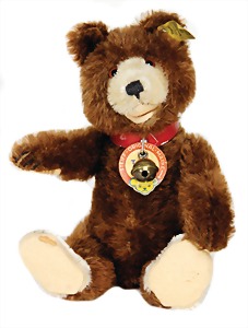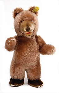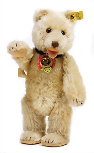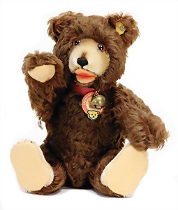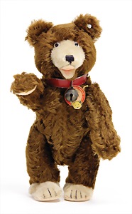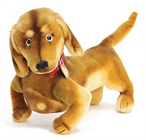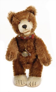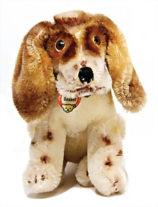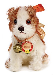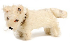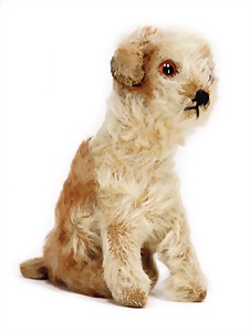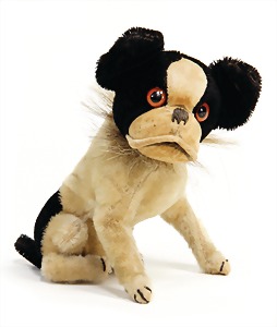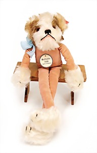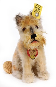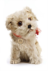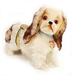 Musik-Charly, Hund, 25 cm hoch, 35 cm lang, Knopf mit langgezogenem f, rote Fahne, Nr. 1325,03, Schild mit roter Schrift "Charly", Orig.-Papier-Banderole mit Bedienungsanleitung des Drücker-Musikwerkes im Bauch, in 3 Sprachen, mit 2 weiteren Knöpfen mit langgezogenem f befestigt, lang gelockter Mohair-Plüsch, schöne kräftige Farbe, Drehkopf, Orig.-Seidenschleife, altersbed. brüchig, Schweizer Musikwerk intakt, 1928 - 31, Schild,Fahne u. Benderole unberührt, perfekter, unbespielter Orig.-Zust., selten