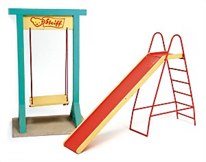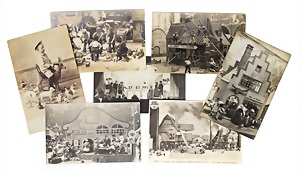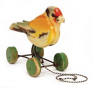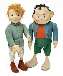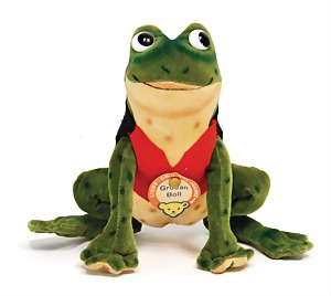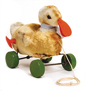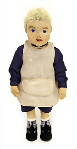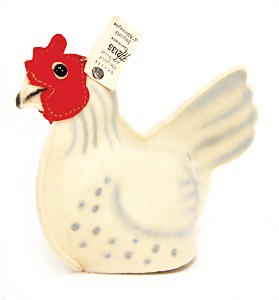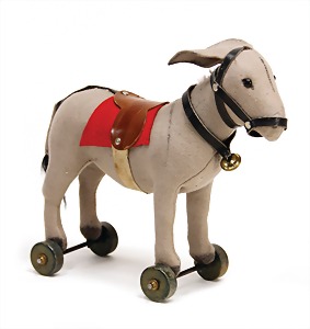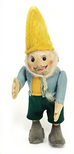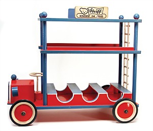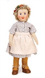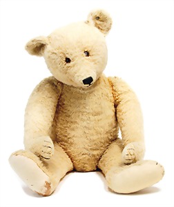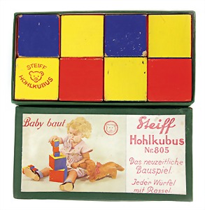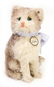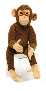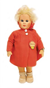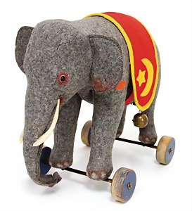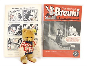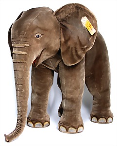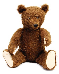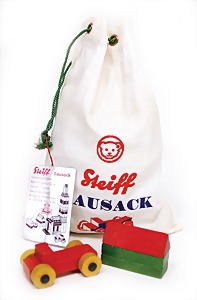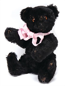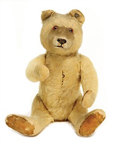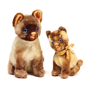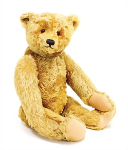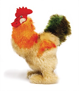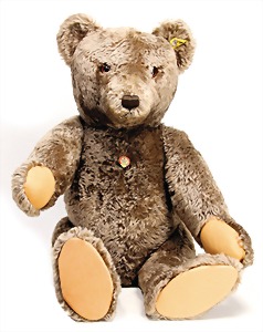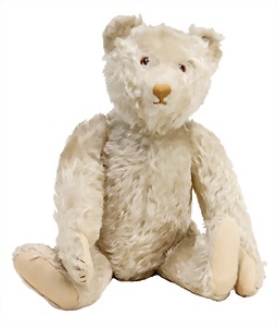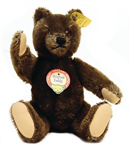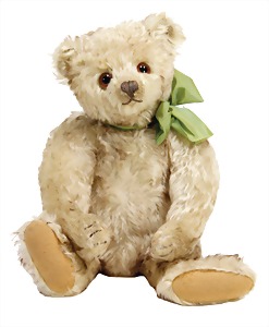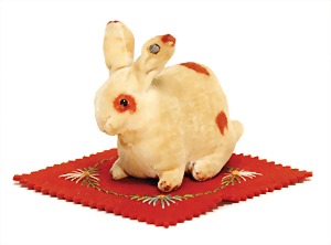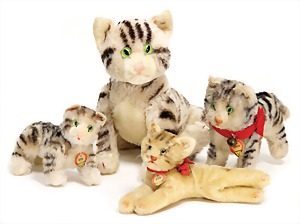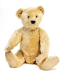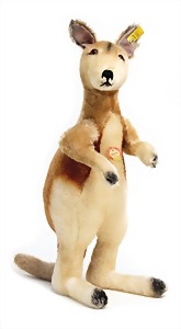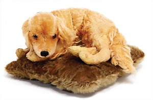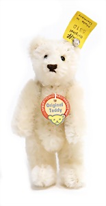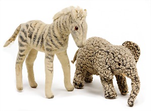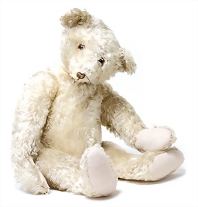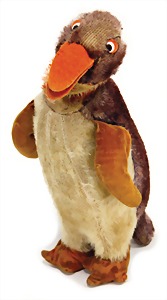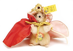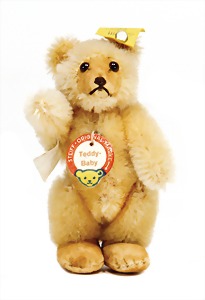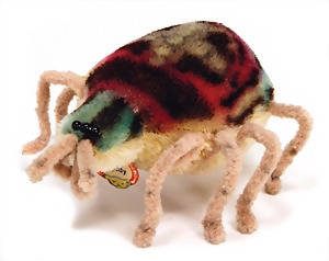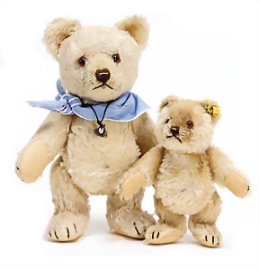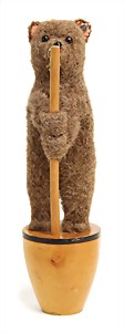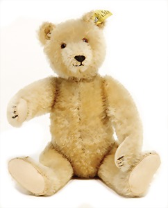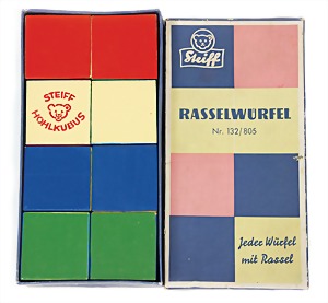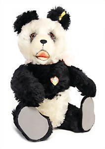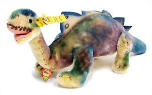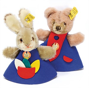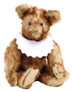 Musik-Charly, Hund, 25 cm hoch, 35 cm lang, Knopf mit langgezogenem f, rote Fahne, Nr. 1325,03, Schild mit roter Schrift "Charly", Orig.-Papier-Banderole mit Bedienungsanleitung des Drücker-Musikwerkes im Bauch, in 3 Sprachen, mit 2 weiteren Knöpfen mit langgezogenem f befestigt, lang gelockter Mohair-Plüsch, schöne kräftige Farbe, Drehkopf, Orig.-Seidenschleife, altersbed. brüchig, Schweizer Musikwerk intakt, 1928 - 31, Schild,Fahne u. Benderole unberührt, perfekter, unbespielter Orig.-Zust., selten