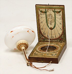 1 Sonnenuhr zum Aufklappen mit Kompass, Holz, Papier beklebt, 9,5 x 6 cm, dazu 1 Puppenstuben-Deckenlampe, mit Glas-Schirm