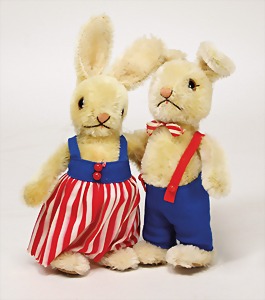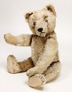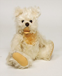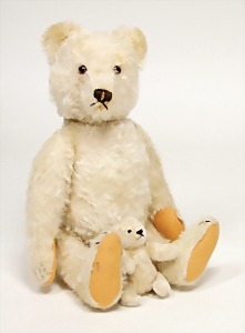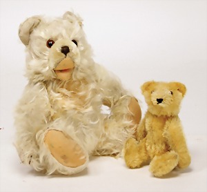 2 Bären, 50er Jahre, 1x Orig.-Teddy, weiß, 34 cm, 1x Biegeteddy, weiß, 10 cm, beides ohne Knopf, Schild und Fahne