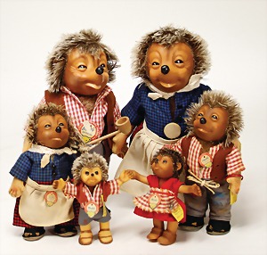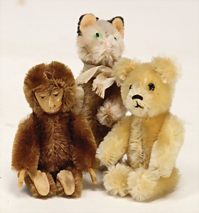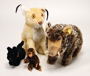 4-tlg., 1x Scotty, mit Knopf und Schild, 10 cm, 1x kl. Jocko, 8 cm, ohne Knopf, Schild und Fahne, 1x Wildschwein, mit Knopf, Schild und Fahne Nr. 1329, 1x Lux, sitzend, mit Knopf, 25 cm